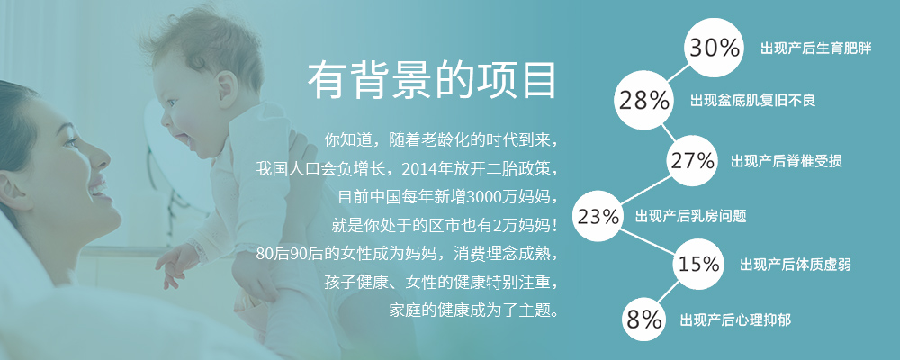 A: 当然有,随着国家三胎政策的开放以及90后妈妈的增加,加上人们消费水平不断提高和年轻一代人意识不断增强,整个产后市场必定是未来10年热门的投资项目。简单的测试就是你在当地的育婴店门口站10分钟,数数过往购物的产后妈妈们,就知道产后市场有多大了。